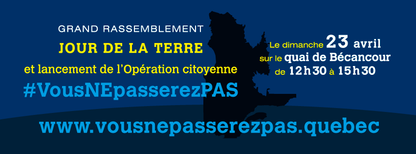 Le MEAC vous convie à célébrer avec nous le Jour de la terre pour dire à quel point l’intégrité de notre territoire nous tient à cœur! Prenez l’autobus avec nous de Montréal et Longueuil direction le Quai de Bécancour, lieu symbolique avec les projets de gaz de schiste d’un côté du fleuve, le tracé du pipeline Énergie Est de l’autre. En disant haut et fort #VousNEpasserezPAS!, nous voulons signifier aux gouvernements et aux compagnies que nous n’accepterons pas le développement des énergies fossiles au Québec. Le rassemblement du 23 avril est familial et festif. Il y aura de la musique, des orateurs et d’autres surprises. Activités gratuites sur place. Plus détails sur l’évènement