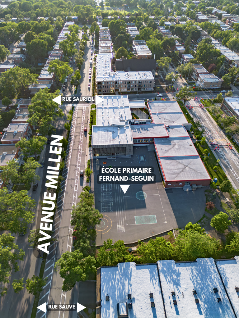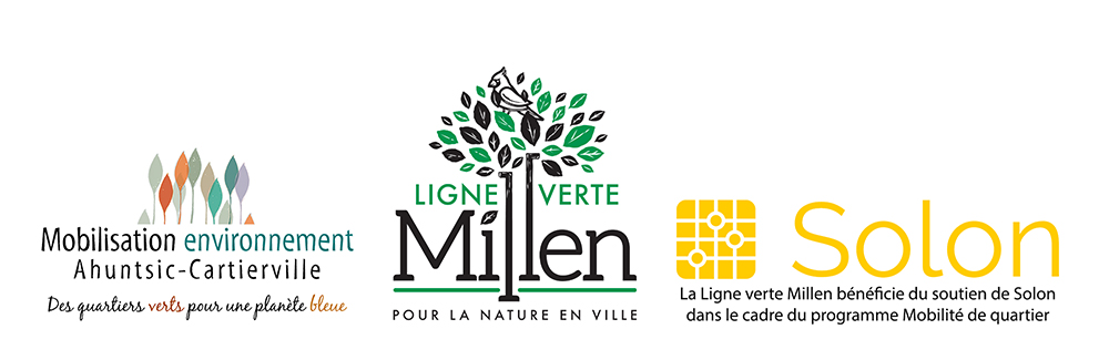 Le projet Ligne verte Millen propose de réaménager l’avenue Millen entre les rues Sauriol et Sauvé. Ce tronçon, qui comporte actuellement 6 voies asphaltées dédiées à l’automobile (tandis que la circulation y est modeste) présente un grand potentiel de déminéralisation. Une partie de la chaussée serait remplacée par un couloir végétal doté d’un sentier, de micro-forêts et d’espaces de jardinage pour les résidents.