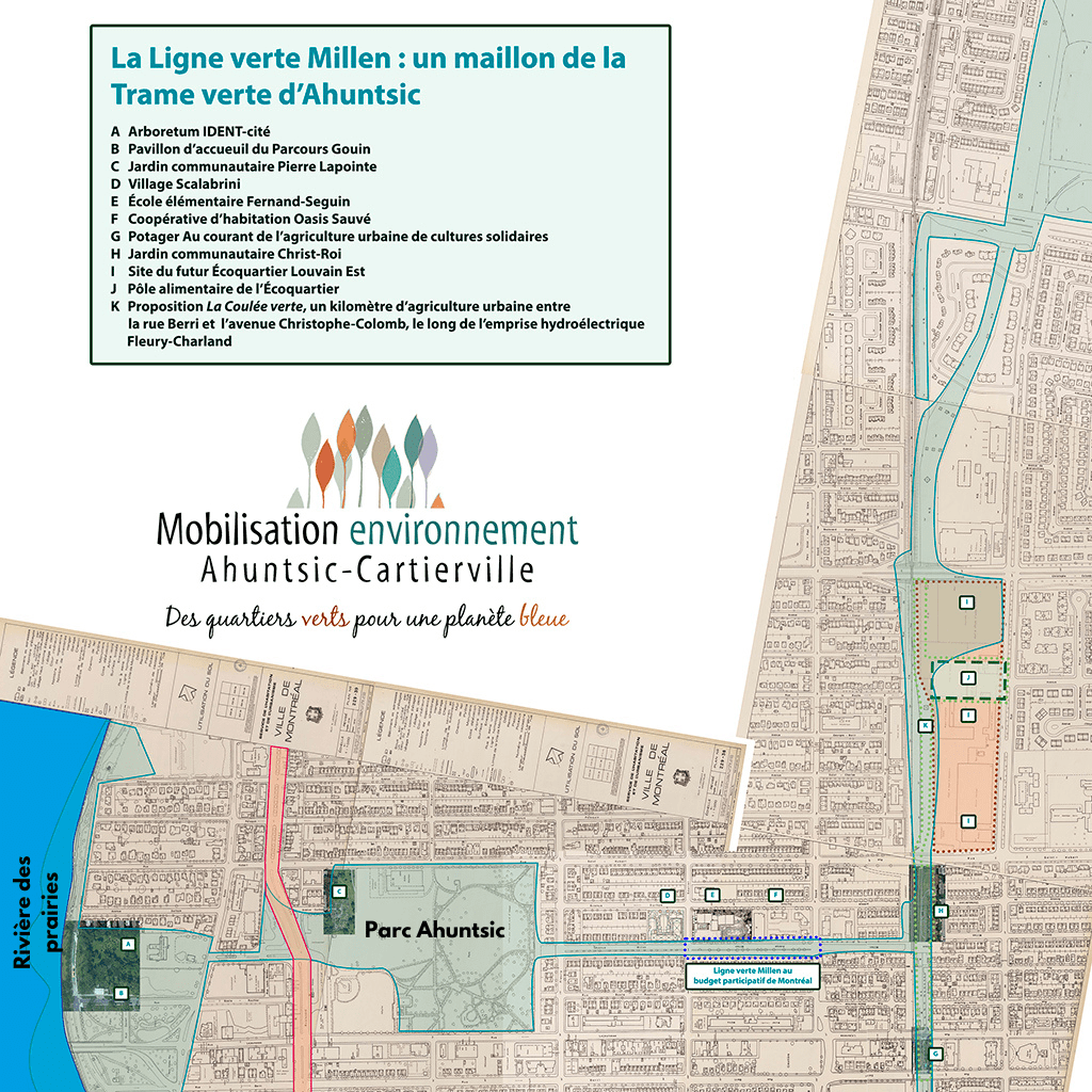 La Ligne verte Millen se trouverait alors au cœur de la trame verte d’Ahuntsic. Plus précisément, elle débuterait depuis le parc Ahuntsic et permettrait à l’usager de se rendre par un sentier partagé jusqu’à la rue Sauvé. Puis, en la prolongeant par-delà la voie ferrée du Canadien National, la Ligne verte Millen deviendrait un maillon important au cœur d’une trame verte entre la rivière des Prairies et une suite d’espaces verts, menant à l’écoquartier Louvain Est, puis au parc Frédéric-Back.