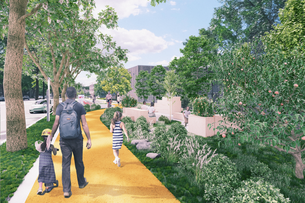 Un pôle de mobilité pourrait être établi pour faciliter l’accès des résidents à des véhicules partagés, des bornes de recharge et des aménagements sécuritaires pour piétons et cyclistes. Étant déjà à proximité de deux stations de métro et de plusieurs lignes d’autobus, c’est l’emplacement idéal pour l’adoption des modes de transports actifs et collectifs. Le remplacement d’une partie de la chaussée par des espaces végétalisés permettrait d’améliorer la qualité de l’air, de créer un îlot de fraîcheur et de favoriser une meilleure gestion des eaux de pluie. En somme, la Ligne verte Millen offrirait un paysage urbain renaturalisé, apaisé, et moins bruyant en adéquation avec la nouvelle réalité climatique.
